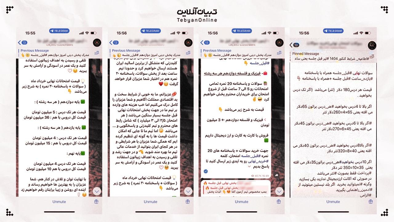 این کانالهای کلاهبرداری مدعیاند از طریق رابطهایی با نفوذ بسیار زیاد به سؤالات دسترسی دارند و طی یک پروسه امنیتی ۵ تا ۷ ساعته پیش از برگزاری امتحان، سوالات را به همراه پاسخنامه، در اختیار خریداران قرار میدهند.