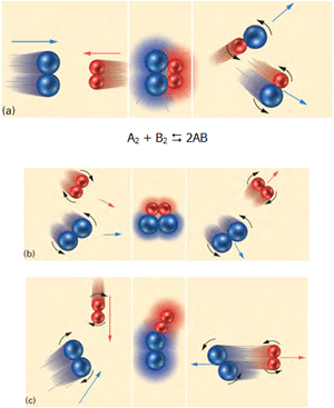 با استفاده از نظریهی برخورد در واکنشهای شیمیایی میتوان این مطلب را درک کرد. یک تغییر شیمیایی که به طور ماکروسکوپی قابل مشاهده است، نتیجهی تعداد زیادی از برخوردها مابین ذرات واکنش دهنده است. در شکل زیر و در حالت a، مولکولهای آبی و قرمز به دلیل اینکه انرژی جنبشی کافی و جهت مناسب دارند، واکنش انجام میگیرد. در حالت b با اینکه مولکولها جهت مناسب دارند ولی انرژی جنبشی کافی ندارند، واکنش انجام نمیگیرد. در حالت c مولکولها در برخورد با هم انرژی جنبشی کافی دارند اما جهتگیری آنها مناسب نیست؛ پس در این حالت نیز واکنش انجام نمیگیرد.