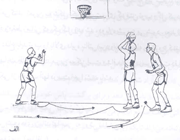 روش: سه مهاجم در فاصله 5/4 الی 5/5 متری سبد و سه مدافع زیر سبد با توپ تمرین را شروع میکنند. تمرین به شکل یک رقابت برای گرفتن توپ و گل کردن آن انجام میشود و فقط زمانی که یک گل زده شد، دوباره شروع می شو. بعد از یک ریباند دفاعی، دفاع باید توپ را بالای دایره پنالتی ببرد و بعد حمله را شروع کند تا بتواند در نقش مهاجم ظاهر شود. مربی ممکن است مدافعان را در موقعیت دفاع نگاه دارد هر گاه یکی از وظایف آنها درست اجرا نشده باشد.