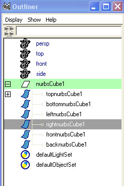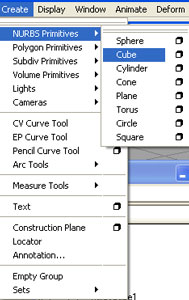 1– برنامهMaya 5 را باز كنید مطمئن شوید كه دكمهConstruction history در نوار ابزار فعال باشد . سپس بترتیبCreate®nurbs primitives®cube در نوار منو را كلیك كنید تا یك مكعب در نقطه مركزی ایجاد شود .