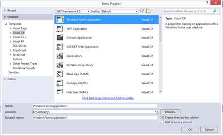 و پس از انتخاب زبان # c با انتخاب پروژه ی Windows Form Application و نوشتن یک نام برای آن، تایید کنید تا پروژه شما ایجاد شود.