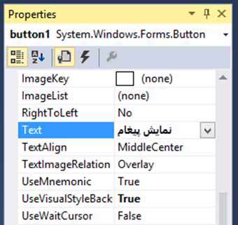 گفتیم که برای تغییر خصوصیات یک کنترلر می توان از Properties استفاده نمود، برای مثال در اینجا text را به "نمایش پیغام" تغییر دهید. سپس مجدد به فایل Form1.Designer.cs بازگردید، خواهید دید که این ویژگی در آنجا نیز به روز رسانی شده است.
