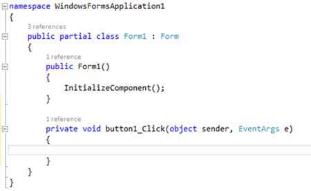 حال در فایل Form1.cs روی دکمه دابل کلیک کنید، برنامه شما به قسمتی مانند زیر خواهد برد: