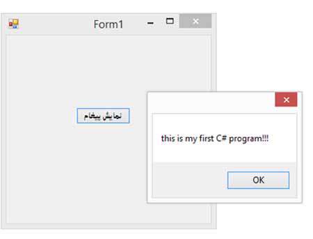 وقتی برنامه را اجرا کنید، بعد از هر بار کلیک روی دکمه، پیغام را مشاهده خواهید کرد، تابع MessageBox.Show یک پیغام را در صفحه نمایش می دهد این تابع پارامترهای مختلفی را دریافت می کند، ما می توانیم با قراردادن متنی در داخل "" یک رشته متنی را به عنوان پیغام نمایش دهیم.