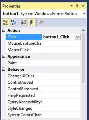 به این اتفاق (کلیک شدن روی دکمه) یک رویداد (event) و به تابع button1_Click یک event handler گفته می شود، برنامه های ویندوزی مبتنی بر رویدادها هستند و زمانی که کاربر با برنامه ویندوزی شما کار می کند، لازم است از یکی از رویدادهای مثل پنجره، کلیک ماوس، حرکت دادن ماوس، کلیک روی یک دکمه یا تایپ در کار متن، انتخاب یک آیتم از یک منو و .... را استفاده نماید رویدادها متدهایی هستند که تعاملات ما را کنترل و وظایفی را که برای هر اتفاق پیش بینی کرده ایم را اجرا می کنند. همه کنترل ها دارای رویداد می باشند و با انتخاب پنجره خصوصیات هر کنترل و کلیک بر روی دکمه event (آیکن رعد و برق) می توانید لیست رویدادهای هر کنترل را همانند شکل مشاهده کنید.