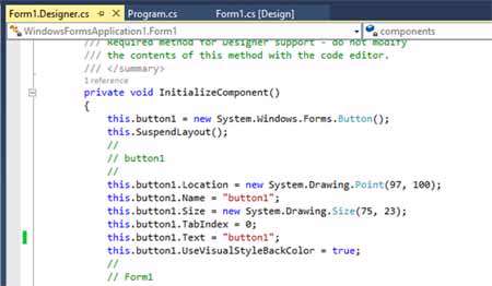 حال اگر برنامه را اجرا کنید، دکمه را روی صفحه مشاهده خواهید کرد. با کلیک راست به روی هر کنترل می توانیم با انتخاب گزینه Properties خصوصیات هر کنترل را که شامل نام و اندازه و مکان و رنگ و ... آن کنترل ها را مشاهده کنیم و تغییر دهیم، به این منو رفته و خاصیت text دکمه را چک کنید، سپس از طریق solution explorer فایل Form1.Designer.cs را باز کرده و قسمت زیر را در آن پیدا کنید:
