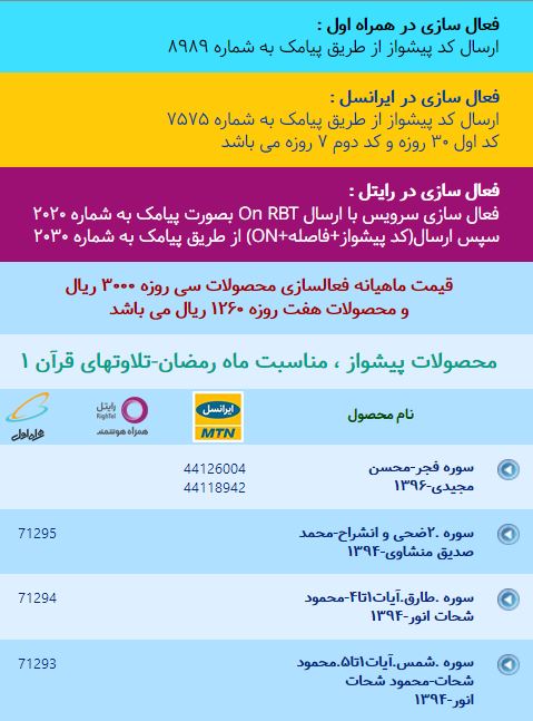 صفحه اصلی محصولات پیشواز آوای پیشواز پیشوازهای قرآنی در اپراتورها کدهای پیشواز با موضوع تلاوت قرآن کریم شنبه ۳۱ فروردین ۱۳۹۸ - ۰۰:۰۰ پیشواز چیست ؟ ، تبیان پیشواز (پیشواز زندگی) بخش محصولات تلفن همراه تبیان کانال تلگرام پیشوازهای تبیان کانال اینستاگرام پیشوازهای تبیان محصولات دفتر خدمات ویژه