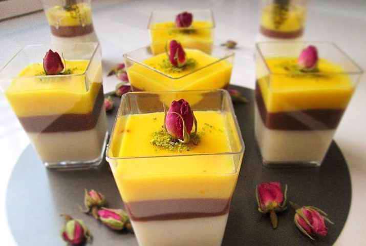 اگر می خواهید دسر سه رنگ داشته باشید می توانید ابتدا دسر ساده درست کنید و بخشی از آن را با پودر کاکائو مخلوط کنید و داخل جام ها بریزید و سپس دسر زعفرانی را روی آن ها بریزید.