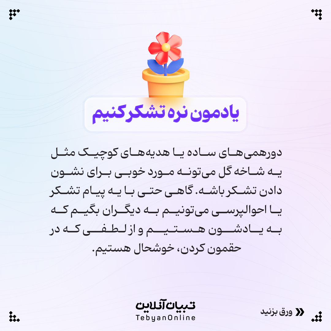 دورهمیهای ساده یا هدیههای کوچیک مثل یه شاخه گل میتونه مورد خوبی برای نشون دادن تشکر باشه. گاهی حتی با یه پیام تشکر یا احوالپرسی میتونیم به دیگران بگیم که به یادشون هستیم و از لطفی که در حقمون کردن، خوشحال هستیم.