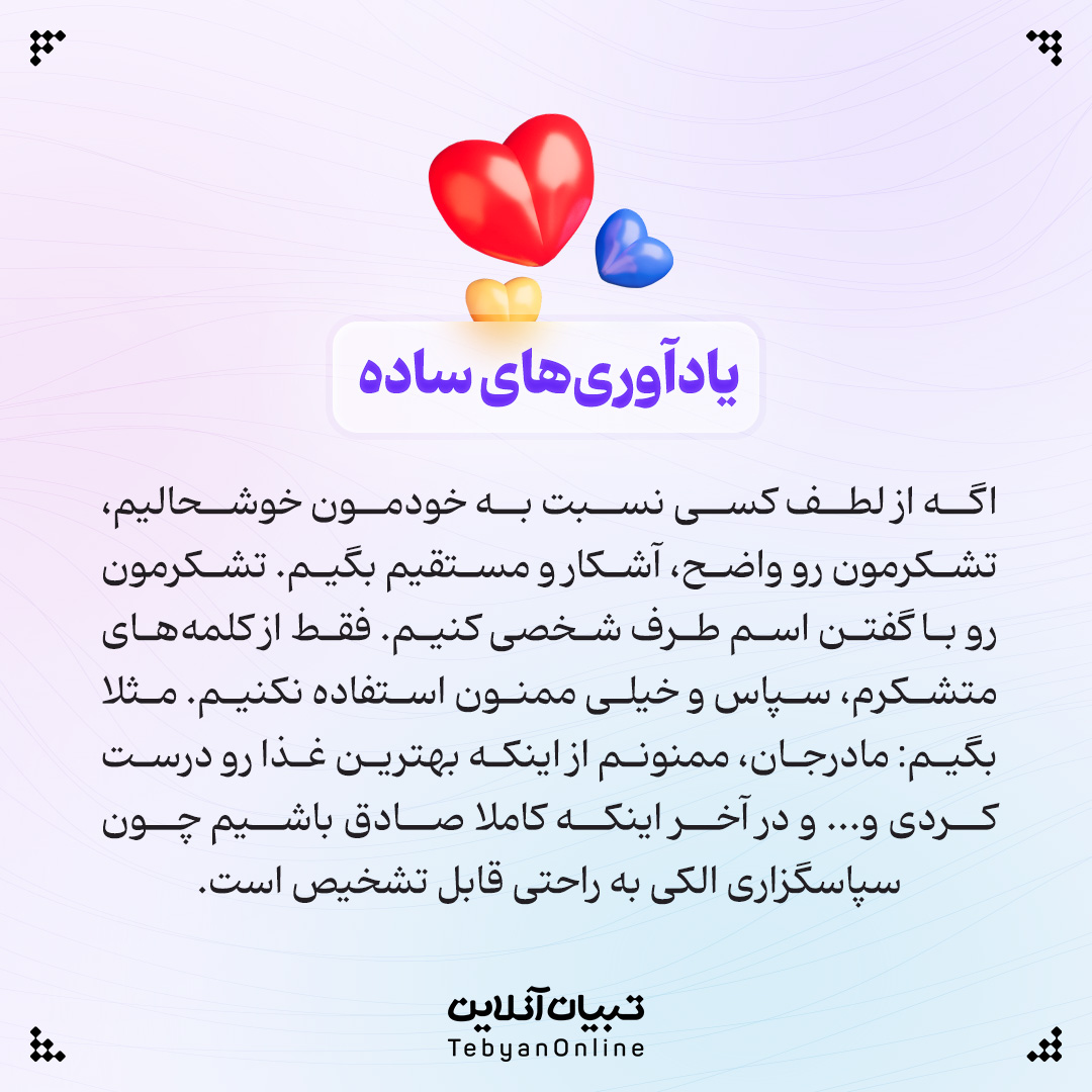 اگه از لطف کسی نسبت به خودمون خوشحالیم، تشکرمون رو واضح، آشکار و مستقیم بگیم. تشکرمون رو با گفتن اسم طرف شخصی کنیم. فقط از کلمههای متشکرم، سپاس و خیلی ممنون استفاده نکنیم. مثلا بگیم: مادرجان، ممنونم از اینکه بهترین غذا رو درست کردی و... و در آخر اینکه کاملا صادق باشیم چون سپاسگزاری الکی به راحتی قابل تشخیص است.