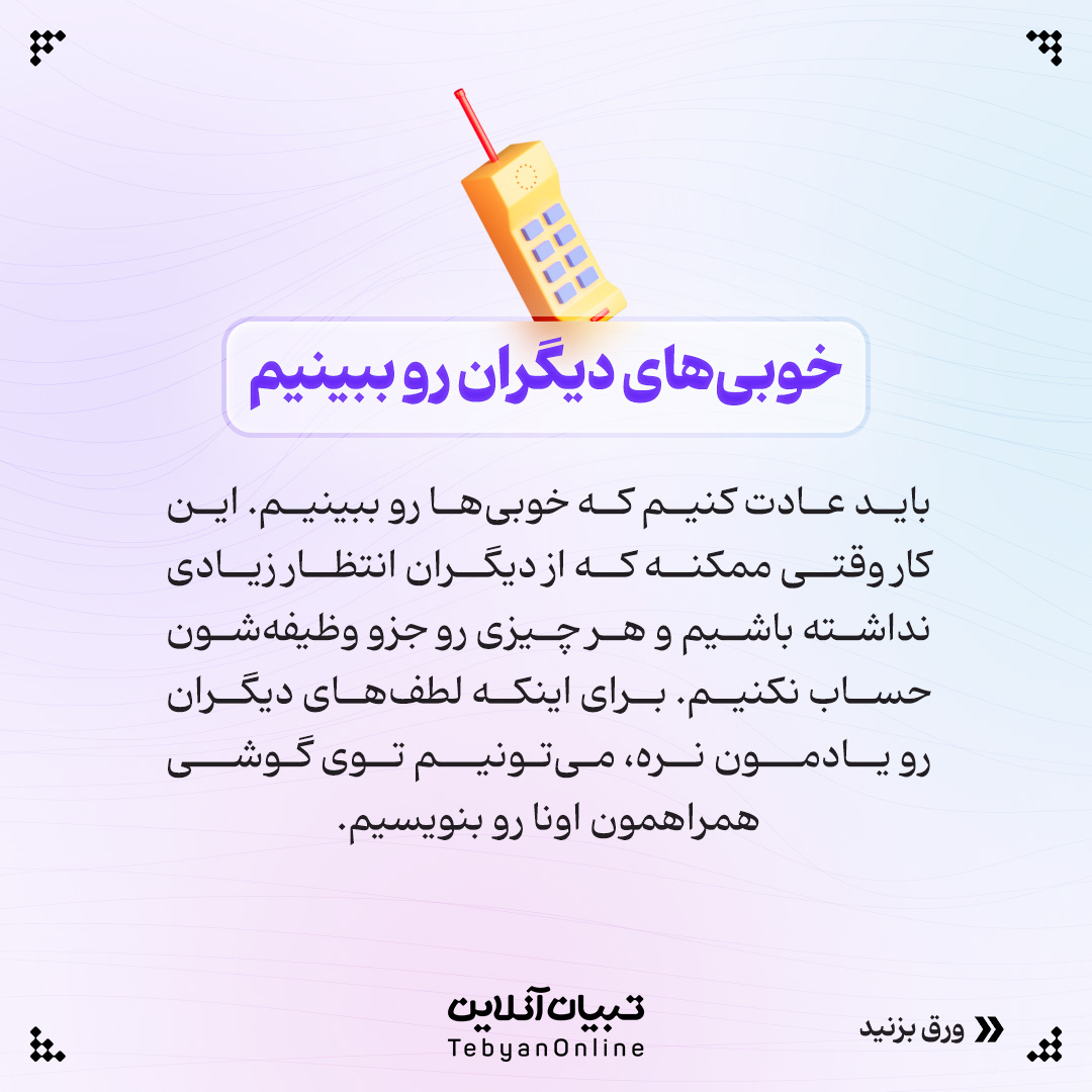 باید عادت کنیم که خوبیها رو ببینیم. این کار وقتی ممکنه که از دیگران انتظار زیادی نداشته باشیم و هر چیزی رو جزو وظیفهشون حساب نکنیم. برای اینکه لطفهای دیگران رو یادمون نره، میتونیم توی گوشی همراهمون اونا رو بنویسیم.