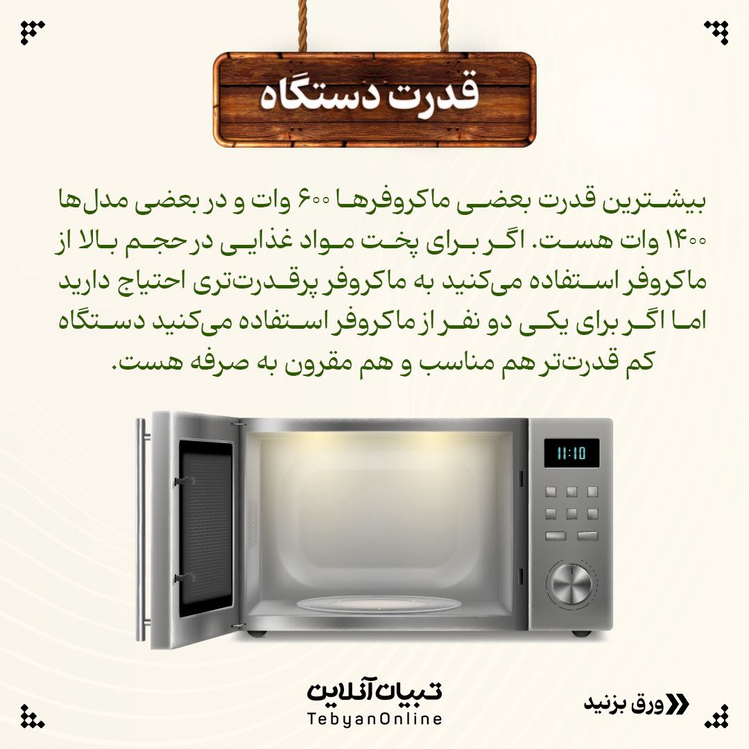 قدرت دستگاه بیشترین قدرت بعضی ماکروفرها ۶۰۰ وات و در بعضی مدلها ۱۴۰۰ وات هست. اگر برای پخت مواد غذایی در حجم بالا از ماکروفر استفاده میکنید به ماکروفر پرقدرتتری احتیاج دارید اما اگر برای یکی دو نفر از ماکروفر استفاده میکنید دستگاه کم قدرتتر هم مناسب و هم مقرون به صرفه هست.
