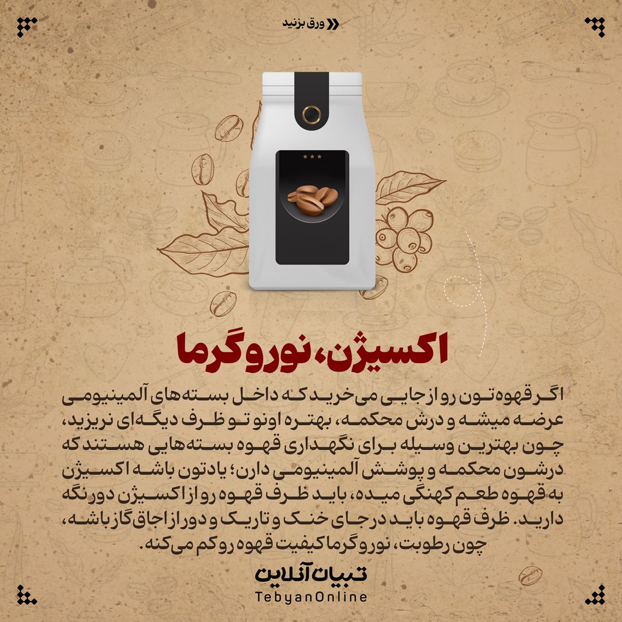 اگر قهوهتون رو از جایی میخرید که داخل بستههای آلمینیومی عرضه میشه و درش محکمه، بهتره اونو تو ظرف دیگهای نریزید، چون بهترین وسیله برای نگهداری قهوه بستههایی هستند که درشون محکمه و پوشش آلمینیومی دارن؛ یادتون باشه اکسیژن به قهوه طعم کهنگی میده، باید ظرف قهوه رو از اکسیژن دور نگه دارید. ظرف قهوه باید در جای خنک و تاریک و دور از اجاقگاز باشه، چون رطوبت، نور و گرما کیفیت قهوه رو کم میکنه.