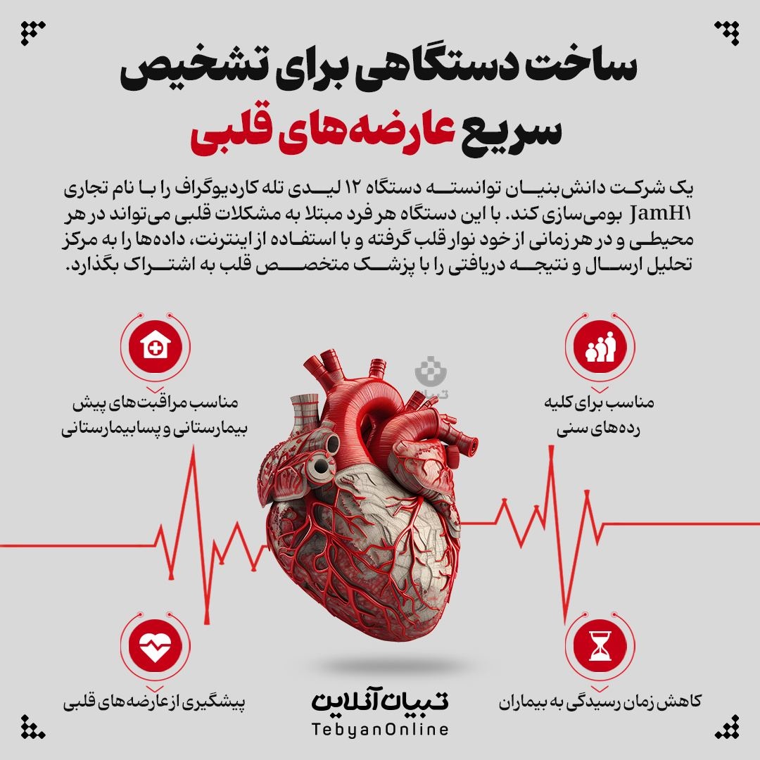 یک شرکت دانشبنیان توانسته دستگاه ۱۲ لیدی تله کاردیوگراف را با نام تجاری JamH1 بومیسازی کند. با این دستگاه هر فرد مبتلا به مشکلات قلبی میتواند در هر محیطی و در هر زمانی از خود نوار قلب گرفته و با استفاده از اینترنت، دادهها را به مرکز تحلیل ارسال و نتیجه دریافتی را با پزشک متخصص قلب به اشتراک بگذارد.