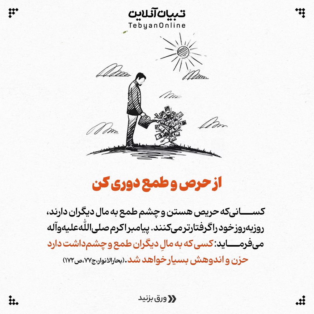 کسانی‌که حریص هستن و چشم طمع به مال دیگران دارند، روزبه‌روز خود را گرفتارتر می‌کنند. پیامبر اکرم ‌صلی‌الله‌علیه‌وآله می‌فرماید: کسی که به مالِ دیگران طمع و چشم‌داشت دارد حزن و اندوهش بسیار خواهد شد. (بحارالانوار، ج۷۷، ص۱۷۲)