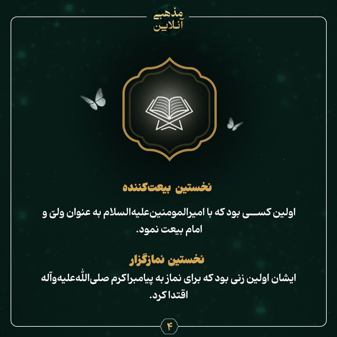 ایشان اولین زنی بود که برای نماز به پیامبراکرم صلیاللهعلیهوآله اقتدا کرد.