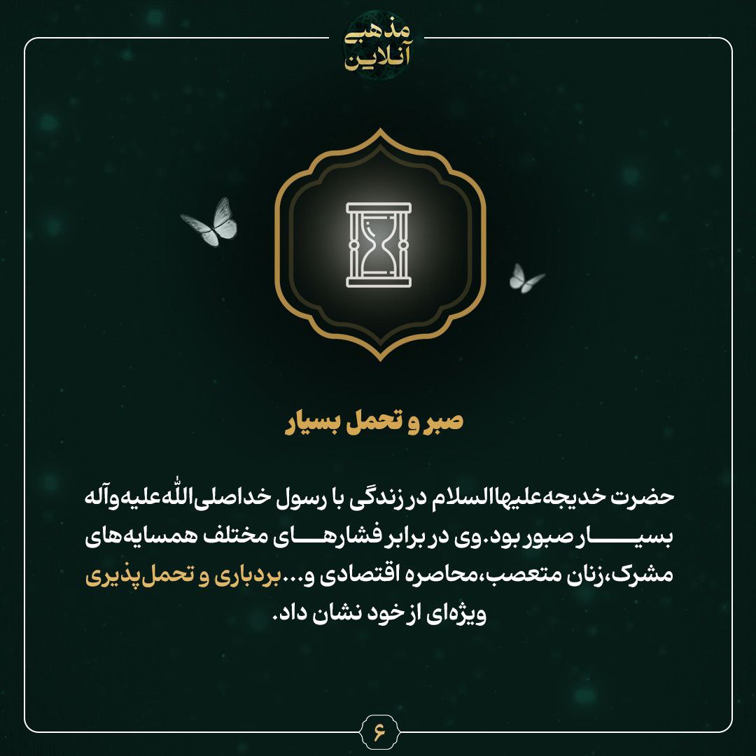 بسیار حضرت خدیجهعلیهاالسلام در زندگی با رسول خداصلیاللهعلیهوآله بسیار صبور بود. وی در برابر فشارهای مختلف همسایههای مشرک، زنان متعصب، محاصره اقتصادی و...بردباری و تحملپذیری ویژهای از خود نشان داد.