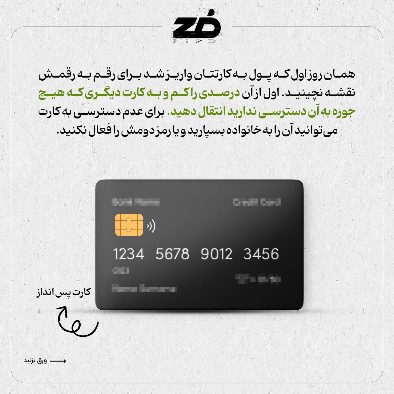 ۲. همان روز اول که پول به کارتتان واریز شد برای رقم به رقمش نقشه نچینید. اول از آن درصدی را کم و به کارت دیگری که هیچ جوره به آن دسترسی ندارید انتقال دهید. برای عدم دسترسی به کارت میتوانید آن را به خانواده بسپارید و یا رمز دومش را فعال نکنید.