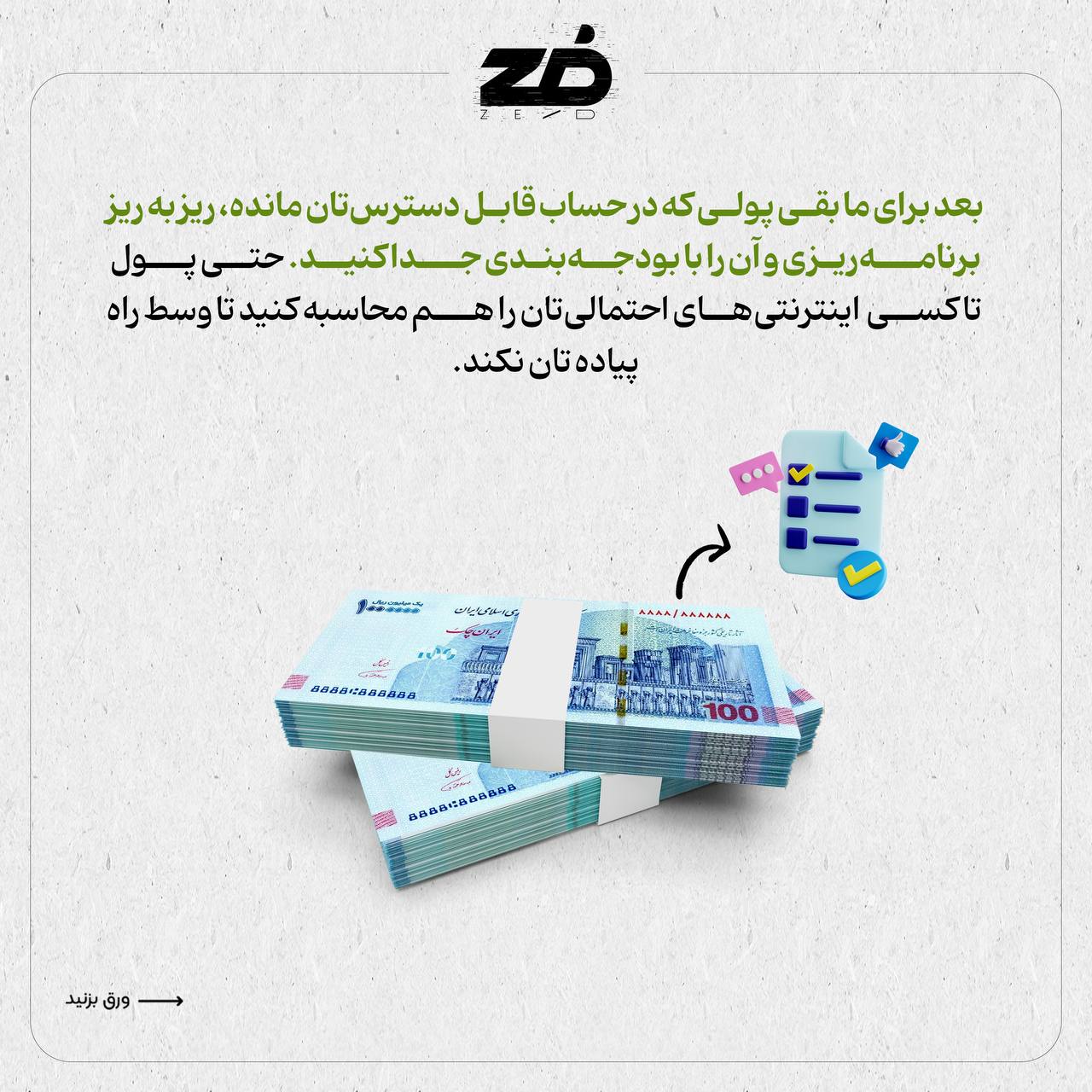 ۳. بعد برای ما بقی پولی که در حساب قابل دسترستان مانده، ریز به ریز برنامهریزی و آن را با بودجهبندی جدا کنید. حتی پول تاکسی اینترنتیهای احتمالیتان را هم محاسبه کنید تا وسط راه پیاده تان نکند.