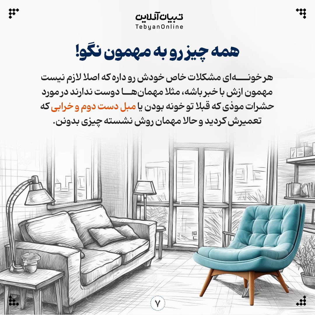 هر خونهای مشکلات خاص خودش رو داره که اصلا لازم نیست مهمون ازش با خبر باشه، مثلا مهمانها دوست ندارند در مورد حشرات موذی که قبلا تو خونه بودن یا مبل دست دوم و خرابی که تعمیرش کردید و حالا مهمان روش نشسته چیزی بدونن.