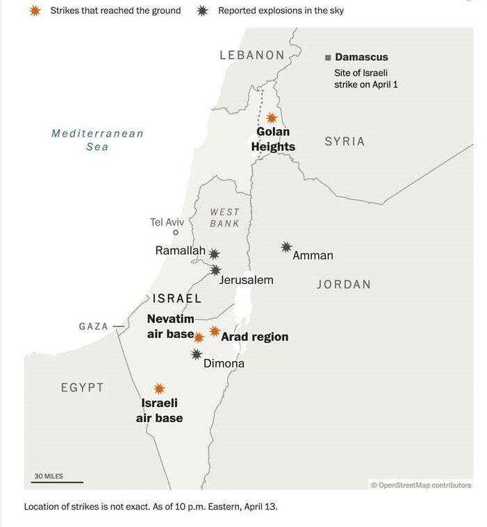 طبق گزارش واشنگتنپست و مطابق با این نقشه، ایران به بلندیهای جولان، منطقه آراد در جنوب اسرائیل، پایگاه هوایی «نواتیم» و «رامون» حمله کرده است.