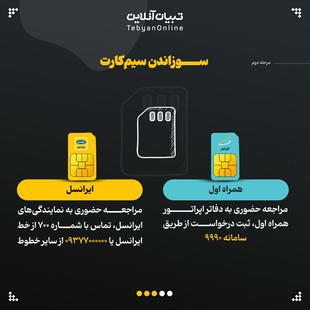 مرحله دوم/ سوزاندن سیمکارت همراه اول مراجعه حضوری به دفاتر اپراتور همراه اول، ثبت درخواست از طریق سامانه ۹۹۹۰ ایرانسل مراجعه حضوری به نمایندگیهای ایرانسل، تماس با شماره 700 از خط ایرانسل یا 09377000000 از سایر خطوط