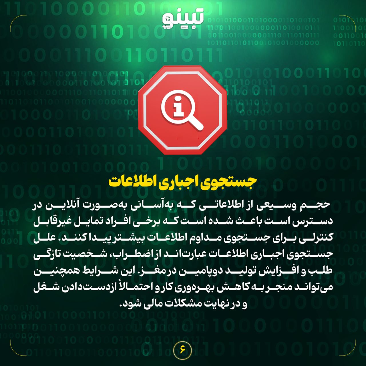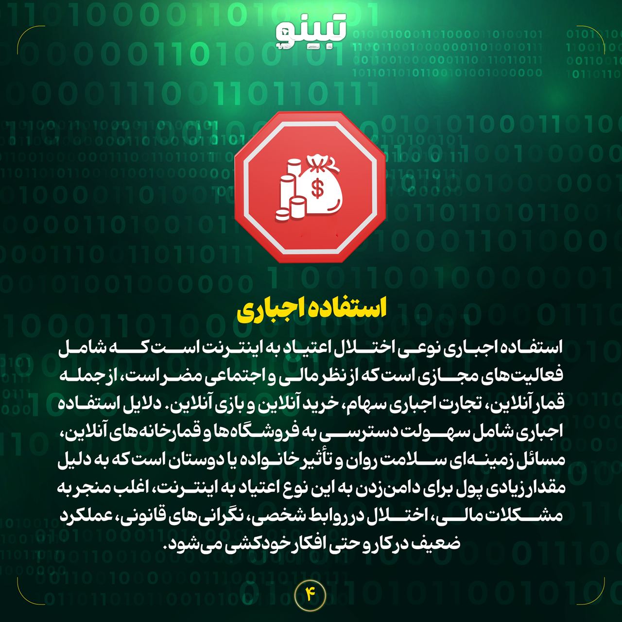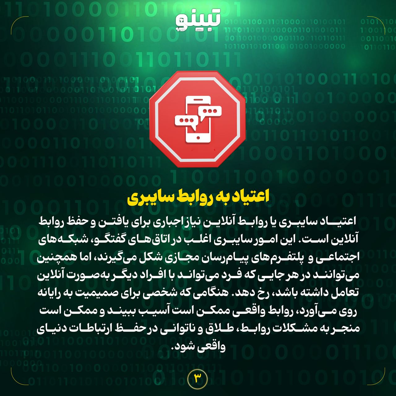 اعتیاد به روابط سایبری اعتیاد سایبری یا روابط آنلاین نیاز اجباری برای یافتن و حفظ روابط آنلاین است. این امور سایبری اغلب در اتاقهای گفتگو، شبکههای اجتماعی و پلتفرمهای پیامرسان مجازی شکل میگیرند، اما همچنین میتوانند در هر جایی که فرد میتواند با افراد دیگر بهصورت آنلاین تعامل داشته باشد، رخ دهد. هنگامی که شخصی برای صمیمیت به رایانه روی میآورد، روابط واقعی ممکن است آسیب ببیند و ممکن است منجر به مشکلات روابط، طلاق و ناتوانی در حفظ ارتباطات دنیای واقعی شود. استفاده اجباری استفاده اجباری نوعی اختلال اعتیاد به اینترنت است که شامل فعالیتهای مجازی است که از نظر مالی و اجتماعی مضر است، از جمله قمار آنلاین، تجارت اجباری سهام، خرید آنلاین و بازی آنلاین. دلایل استفاده اجباری شامل سهولت دسترسی به فروشگاهها و قمارخانههای آنلاین، مسائل زمینهای سلامت روان و تأثیر خانواده یا دوستان است که به دلیل مقدار زیادی پول برای دامنزدن به این نوع اعتیاد به اینترنت، اغلب منجر به مشکلات مالی، اختلال در روابط شخصی، نگرانیهای قانونی، عملکرد ضعیف در کار و حتی افکار خودکشی میشود. اعتیاد به بازی اعتیاد به رایانه یا بازی شامل صرف زمان زیادی از صفحهنمایش برای انجام بازیهای ویدئویی است تا جایی که در عملکرد روزانه فرد مبتلا اختلال ایجاد میکند. علل اعتیاد به رایانه شامل برانگیختگی بیش از حد از طریق افزایش دوپامین در مغز، اعتمادبهنفس پایین و اضطراب اجتماعی است. پیامدهای مرتبط با اعتیاد به رایانه یا بازی نیز میتواند شدید باشد و ممکن است شامل چاقی، مشکل در خواب یا بیخوابی، عدم مهارتهای اجتماعی، مشکلات گردن و کمر، فشار چشم، و مشکلات در کار یا مدرسه باشد. جستجوی اجباری اطلاعات حجم وسیعی از اطلاعاتی که بهآسانی بهصورت آنلاین در دسترس است باعث شده است که برخی افراد تمایل غیرقابلکنترلی برای جستجوی مداوم اطلاعات بیشتر پیدا کنند. علل جستجوی اجباری اطلاعات عبارتاند از اضطراب، شخصیت تازگی طلب و افزایش تولید دوپامین در مغز. این شرایط همچنین میتواند منجر به کاهش بهرهوری کار و احتمالاً ازدستدادن شغل و در نهایت مشکلات مالی شود.
