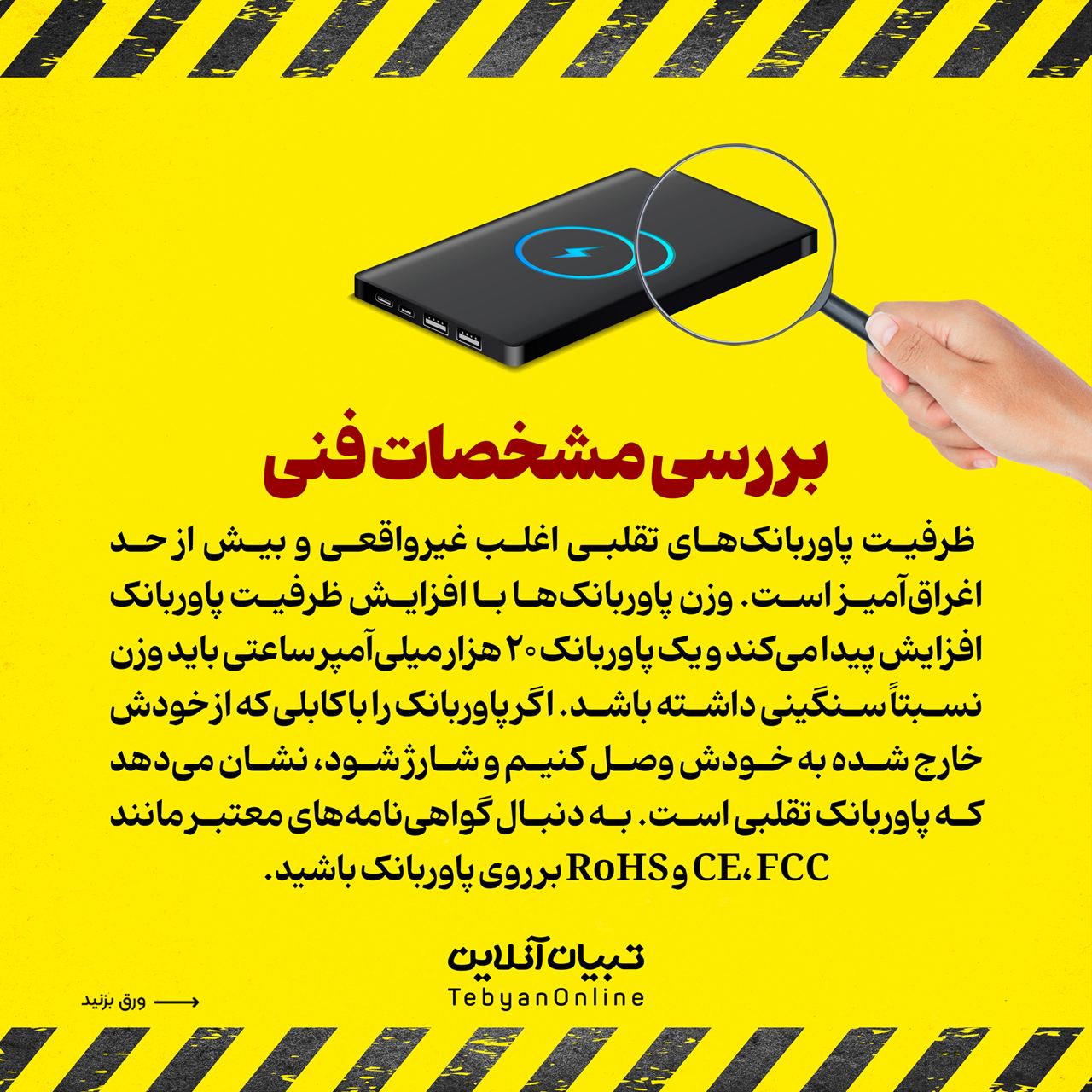 ۳. بررسی مشخصات فنی ظرفیت پاوربانکهای تقلبی اغلب غیرواقعی و بیش از حد اغراقآمیز است. وزن پاوربانکها با افزایش ظرفیت پاوربانک افزایش پیدا میکند و یک پاوربانک ۲۰ هزار میلیآمپر ساعتی باید وزن نسبتاً سنگینی داشته باشد. اگر پاوربانک را با کابلی که از خودش خارج شده به خودش وصل کنیم و شارژ شود، نشان میدهد که پاوربانک تقلبی است. به دنبال گواهینامههای معتبر مانند CE، FCC و RoHS بر روی پاوربانک باشید.
