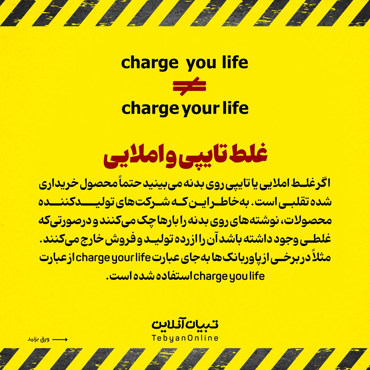 ۶. غلط تایپی و املایی اگر غلط املایی یا تایپی روی بدنه میبینید حتماً محصول خریداری شده تقلبی است. بهخاطر این که شرکتهای تولیدکننده محصولات، نوشتههای روی بدنه را بارها چک میکنند و درصورتیکه غلطی وجود داشته باشد آن را از رده تولید و فروش خارج میکنند. مثلاً در برخی از پاوربانکها بهجای عبارت charge your life از عبارت charge you life استفاده شده است.
