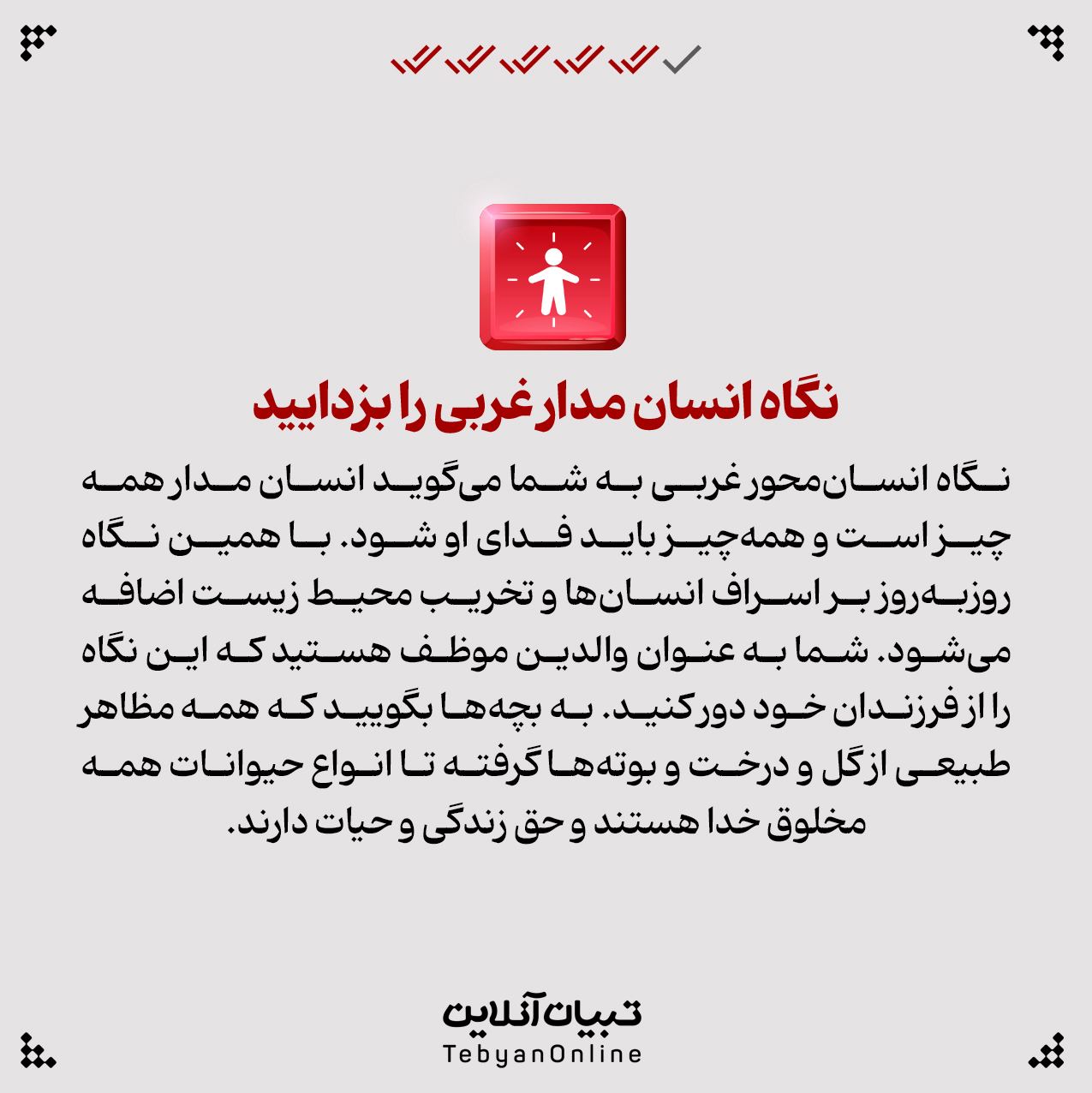 نگاه انسان‌محور غربی به شما می‌گوید انسان مدار همه‌چیز است و همه‌چیز باید فدای او شود. با همین نگاه روزبه‌روز بر اسراف انسان‌ها و تخریب محیط‌ زیست اضافه می‌شود. شما به عنوان والدین موظف هستید که این نگاه را از فرزندان‌ خود دور کنید. به بچه‌ها بگویید که همه مظاهر طبیعی از گل و درخت و بوته‌ها گرفته تا انواع حیوانات همه مخلوق خدا هستند و حق زندگی و حیات دارند.