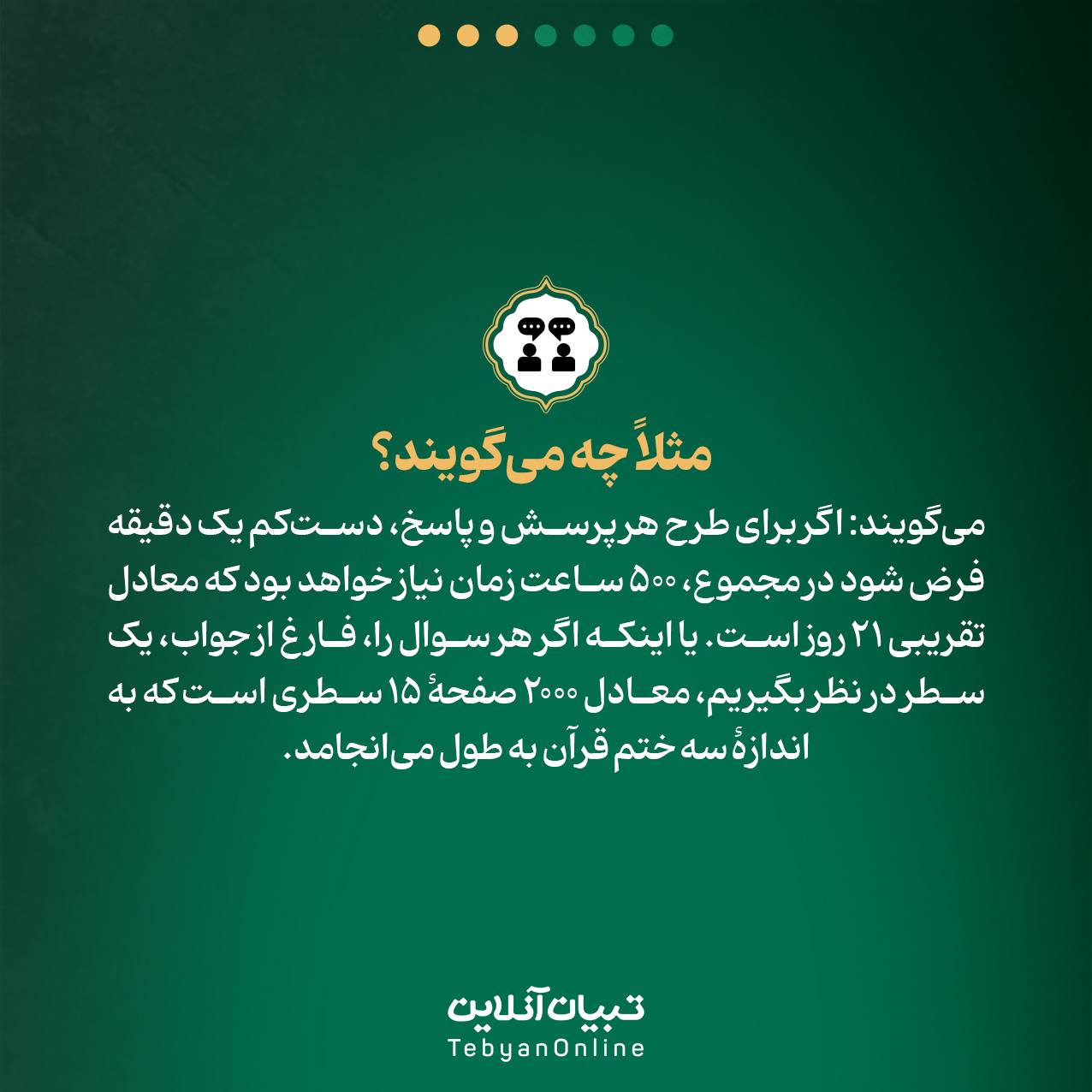 میگویند: اگر برای طرح هر پرسش و پاسخ، دستکم یک دقیقه فرض شود در مجموع، ۵۰۰ ساعت زمان نیاز خواهد بود که معادل تقریبی ۲۱ روز است. یا اینکه اگر هر سوال را، فارغ از جواب، یک سطر در نظر بگیریم، معادل ۲۰۰۰ صفحۀ ۱۵ سطری است که به اندازۀ سه ختم قرآن به طول میانجامد.
