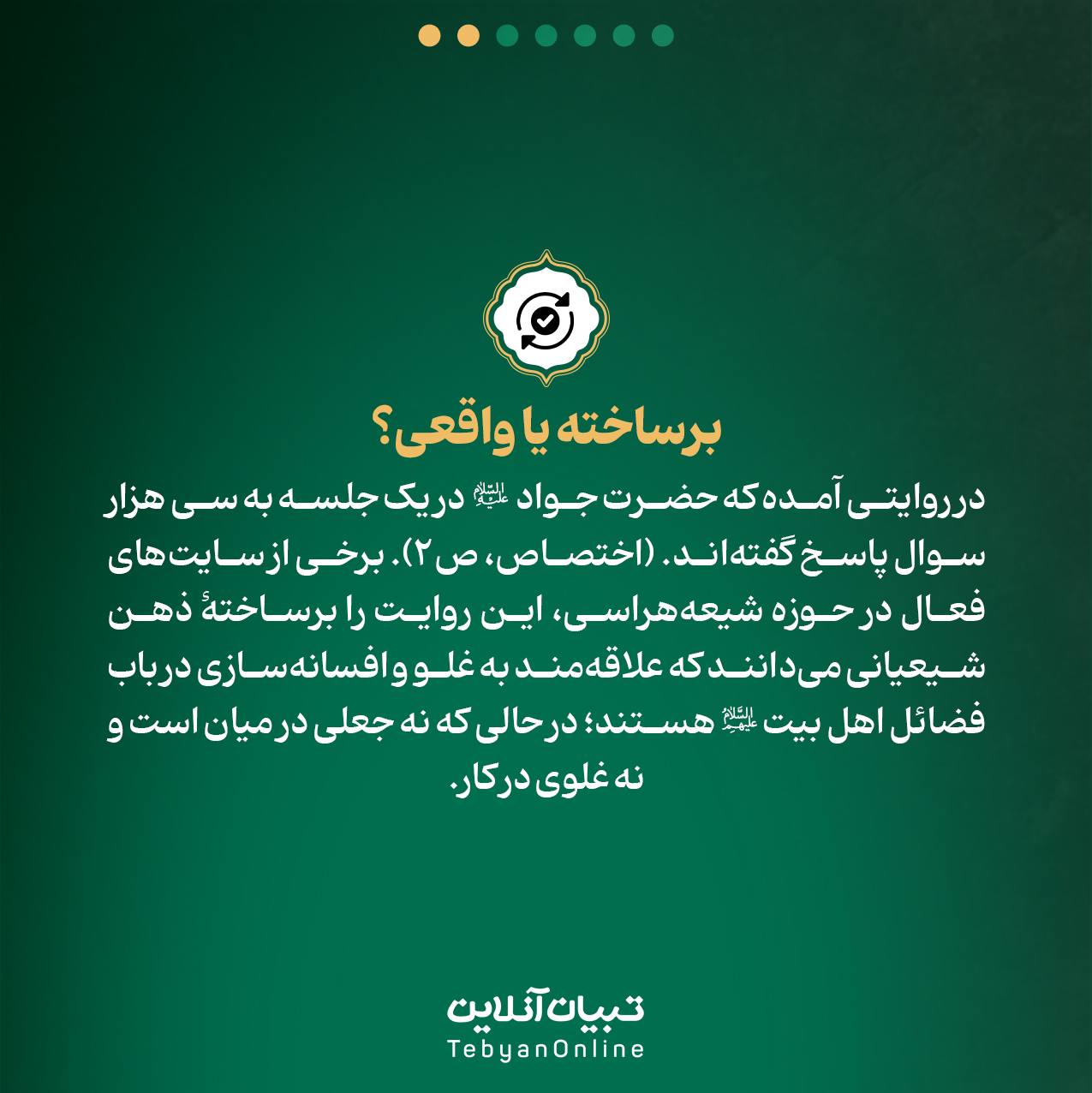 برساخته یا واقعی؟ در روایتی آمده که حضرت جواد علیهالسلام در یک جلسه به سی هزار سوال پاسخ گفتهاند. (اختصاص، ص۲). برخی از سایتهای فعال در حوزه شیعههراسی، این روایت را برساختۀ ذهن شیعیانی میدانند که علاقهمند به غلو و افسانهسازی در باب فضائل اهل بیت علیهمالسلام هستند؛ در حالی که نه جعلی در میان است و نه غلوی در کار.