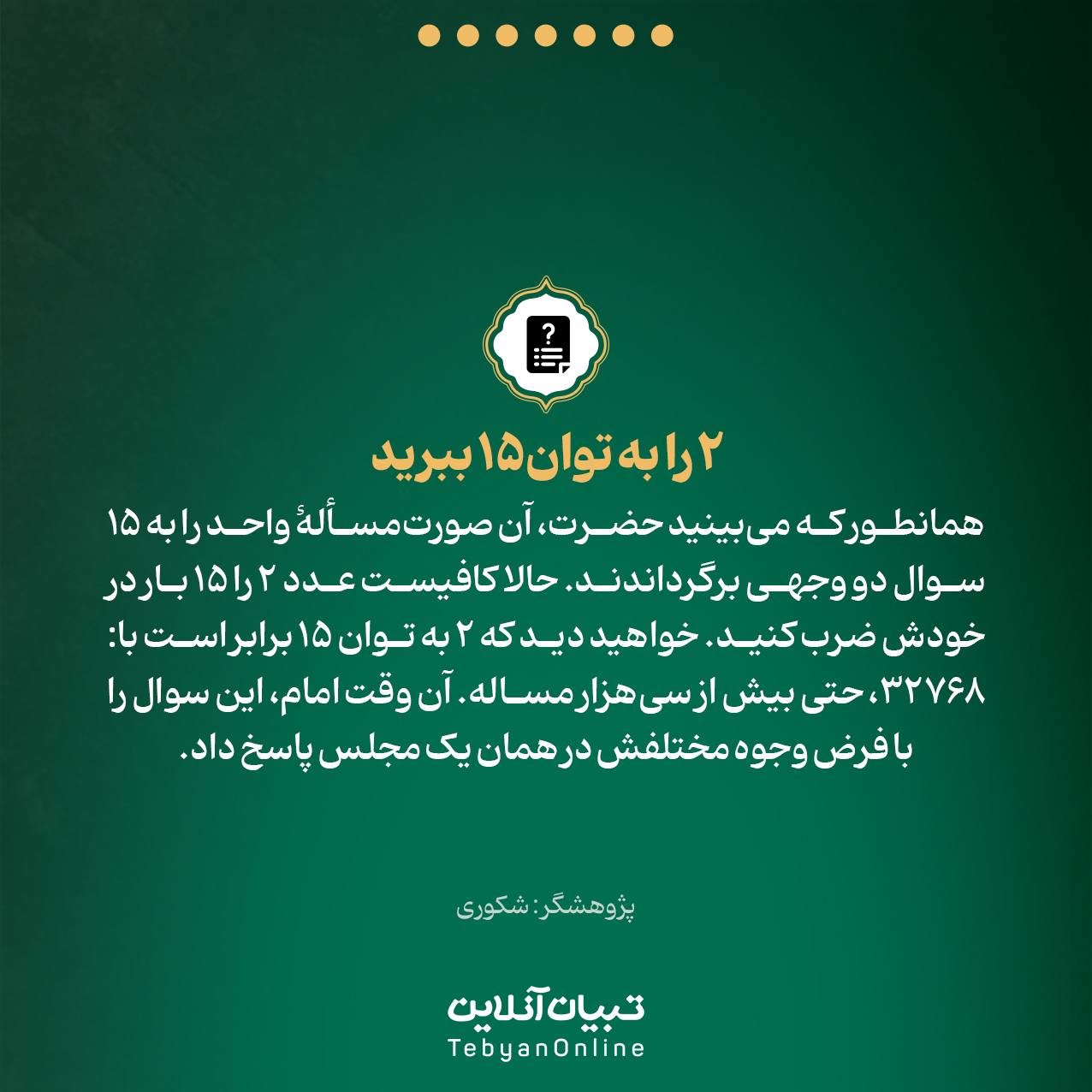 همانطور که میبینید حضرت، آن صورتمسألۀ واحد را به ۱۵ سوال دو وجهی برگرداندند. حالا کافیست عدد ۲ را ۱۵ بار در خودش ضرب کنید. خواهید دید که ۲ به توان ۱۵ برابر است با: ۳۲۷۶۸، حتی بیش از سیهزار مساله. آن وقت امام، این سوال را با فرض وجوه مختلفش در همان یک مجلس پاسخ داد.