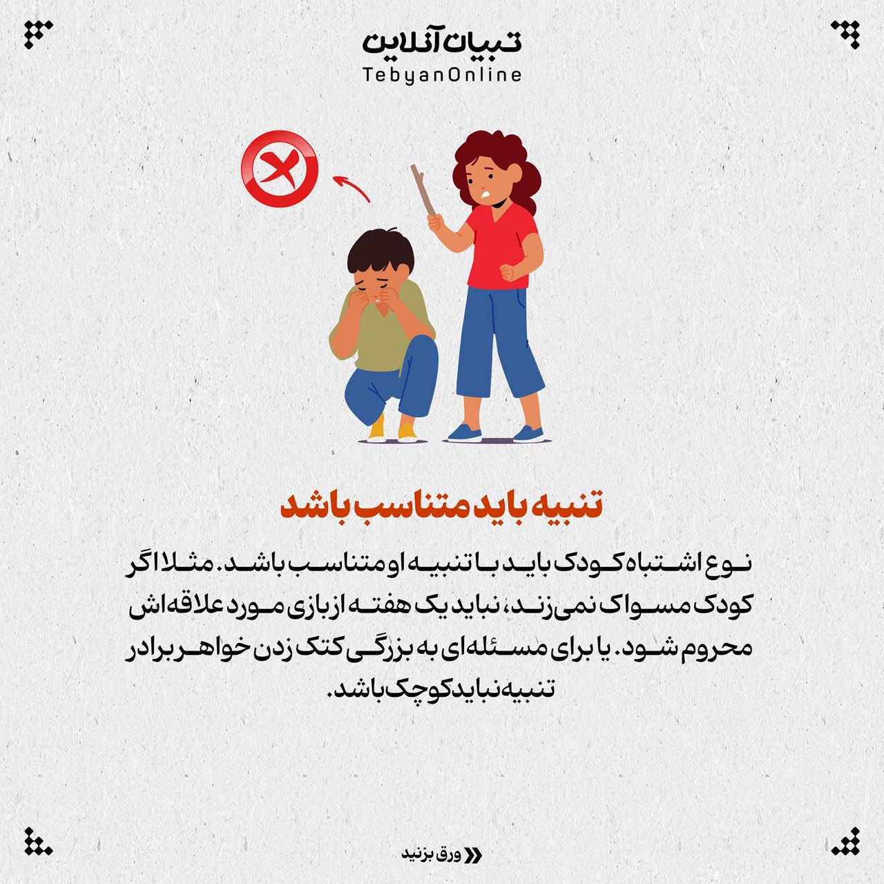 تنبیه باید متناسب باشد نوع اشتباه کودک باید با تنبیه او متناسب باشد. مثلا اگر کودک مسواک نمی‌زند، نباید یک هفته از بازی مورد علاقه‌اش محروم شود. یا برای مسئله‌ای به بزرگی کتک زدن خواهر برادر تنبیه نباید کوچک باشد.