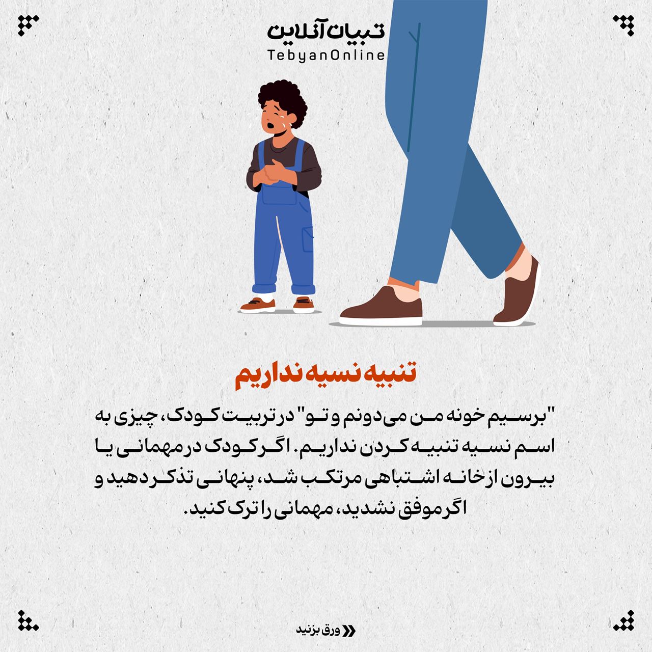 "برسیم خونه من می‌دونم و تو" در تربیت کودک، چیزی به اسم نسیه تنبیه کردن نداریم. اگر کودک در مهمانی یا بیرون از خانه اشتباهی مرتکب شد، پنهانی تذکر دهید و اگر موفق نشدید، مهمانی را ترک کنید.