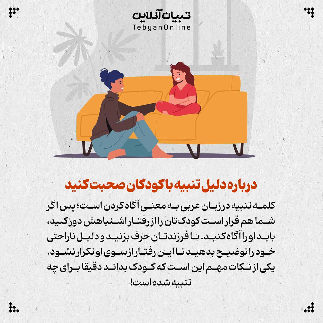 کلمه تنبیه در زبان عربی به معنی آگاه کردن است؛ پس اگر شما هم قرار است کودک‌تان را از رفتار اشتباهش دور کنید، باید او را آگاه کنید. با فرزندتان حرف بزنید و دلیل ناراحتی خود را توضیح بدهید تا این رفتار از سوی او تکرار نشود. یکی از نکات مهم این است که کودک بداند دقیقا برای چه تنبیه شده است!