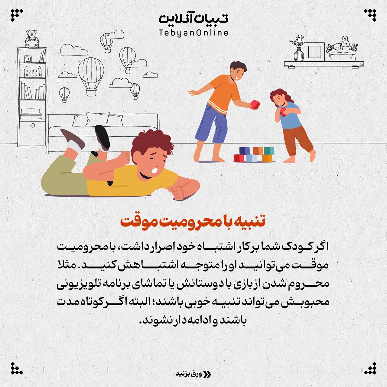 اگر کودک شما بر کار اشتباه خود اصرار داشت، با محرومیت موقت می‌توانید او را متوجه اشتباهش کنید. مثلا محروم شدن از بازی با دوستانش یا تماشای برنامه تلویزیونی محبوبش می‌تواند تنبیه خوبی باشند؛ البته اگر کوتاه مدت باشند و ادامه‌دار نشوند.
