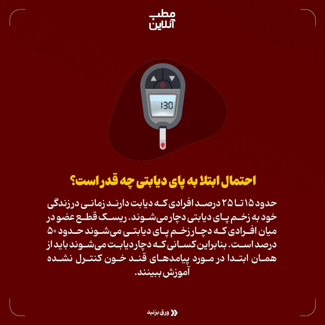 حدود ۱۵ تا ۲۵ درصد افرادی که دیابت دارند زمانی در زندگی خود به زخم پای دیابتی دچار می‌شوند. ریسک قطع عضو در میان افرادی که دچار زخم پای دیابتی می‌شوند حدود ۵۰ درصد است. بنابراین کسانی که دچار دیابت می‌شوند باید از همان ابتدا در مورد پیامدهای قند خون کنترل نشده آموزش ببینند.