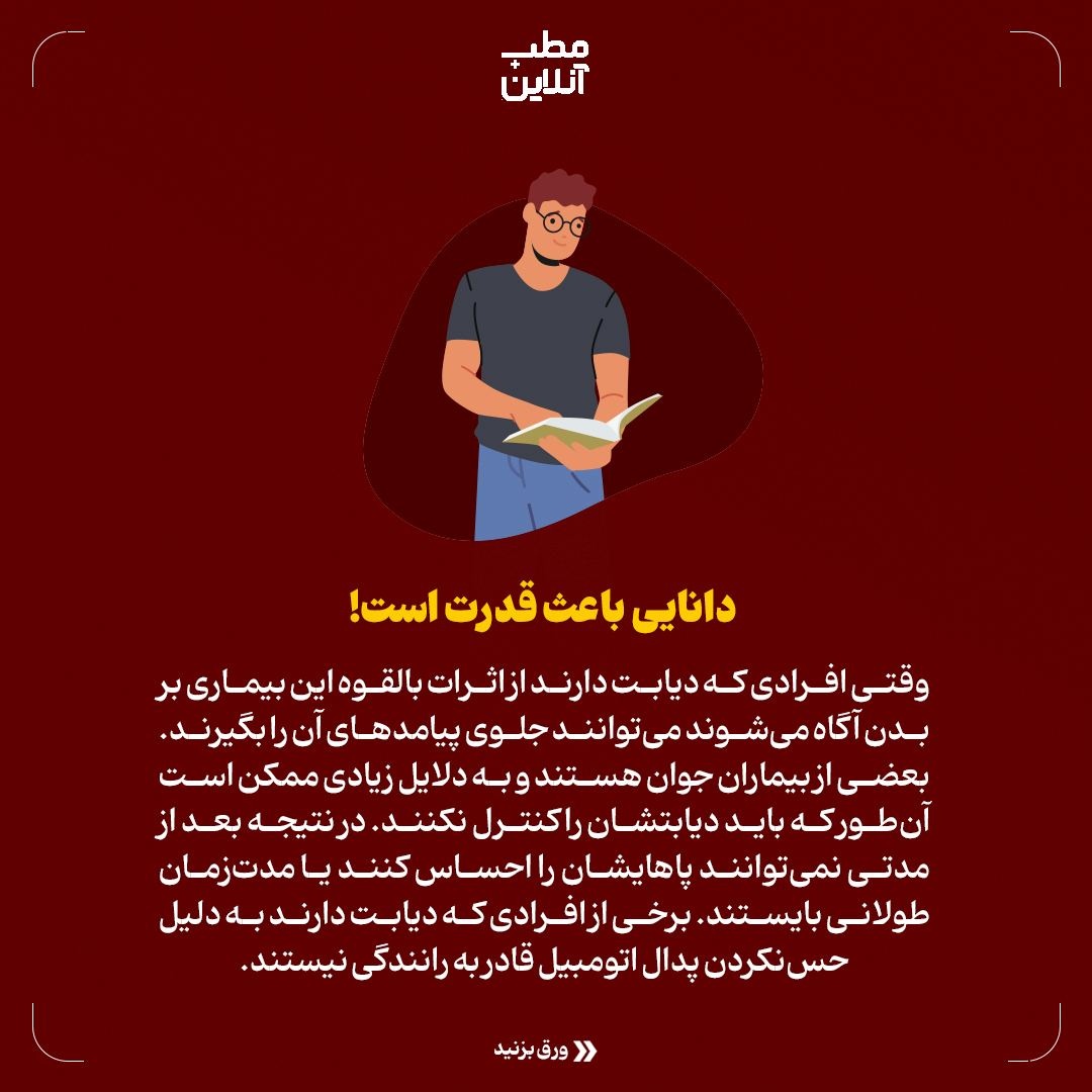 وقتی افرادی که دیابت دارند از اثرات بالقوه این بیماری بر بدن آگاه می‌شوند می‌توانند جلوی پیامدهای آن را بگیرند. بعضی از بیماران جوان هستند و به دلایل زیادی ممکن است آن‌طور که باید دیابتشان را کنترل نکنند. در نتیجه بعد از مدتی نمی‌توانند پاهایشان را احساس کنند یا مدت‌زمان طولانی بایستند. برخی از افرادی که دیابت دارند به دلیل حس‌نکردن پدال اتومبیل قادر به رانندگی نیستند.
