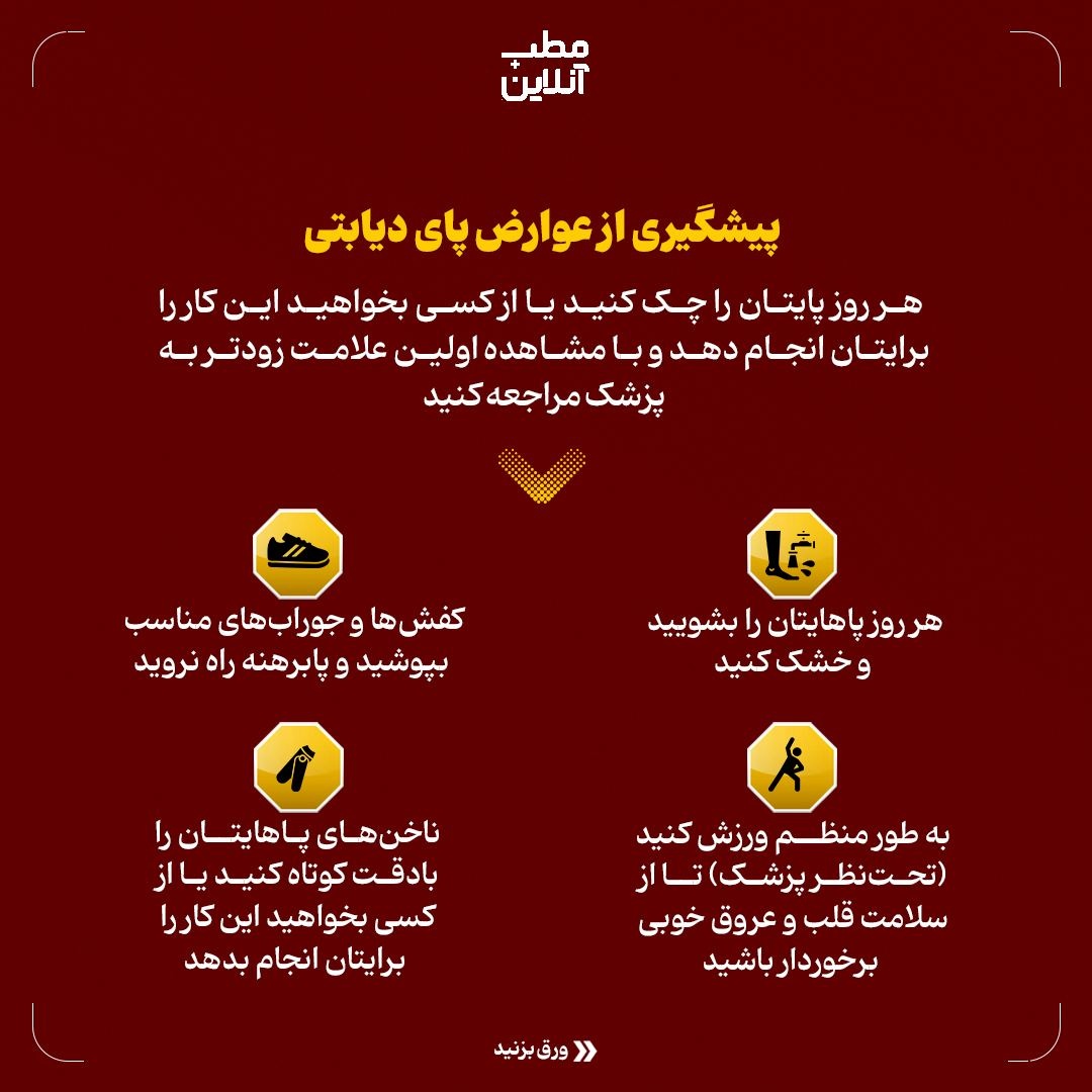 . هر روز پایتان را چک کنید یا از کسی بخواهید این کار را برایتان انجام دهد و با مشاهده اولین علامت زودتر به پزشک مراجعه کنید