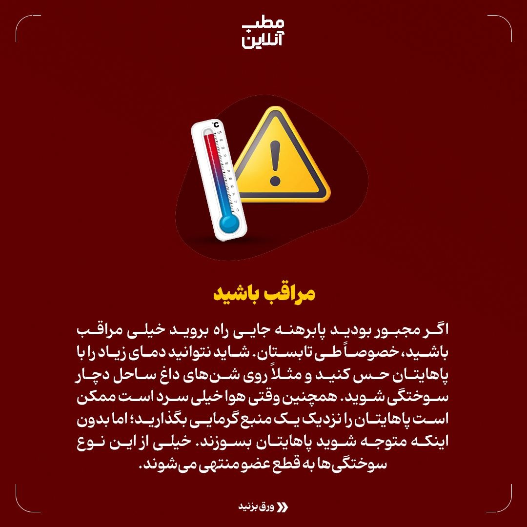 اگر مجبور بودید پابرهنه جایی راه بروید خیلی مراقب باشید، خصوصاً طی تابستان. شاید نتوانید دمای زیاد را با پاهایتان حس کنید و مثلاً روی شن‌های داغ ساحل دچار سوختگی شوید. همچنین وقتی هوا خیلی سرد است ممکن است پاهایتان را نزدیک یک منبع گرمایی بگذارید؛ اما بدون اینکه متوجه شوید پاهایتان بسوزند. خیلی از این نوع سوختگی‌ها به قطع عضو منتهی می‌شوند.