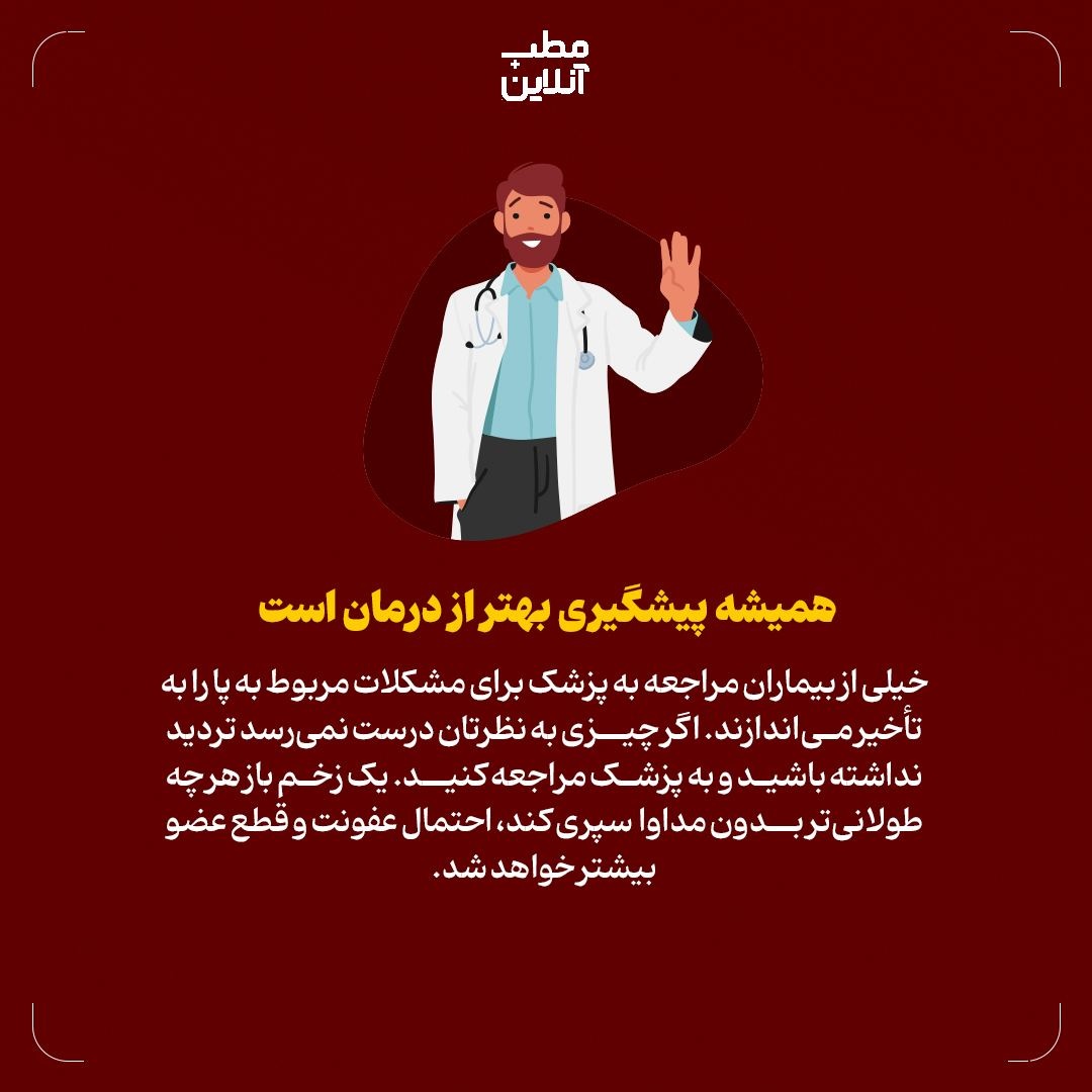 خیلی از بیماران مراجعه به پزشک برای مشکلات مربوط به پا را به تأخیر می‌اندازند. اگر چیزی به نظرتان درست نمی‌رسد تردید نداشته باشید و به پزشک مراجعه کنید. یک زخم باز هر چه طولانی‌تر بدون مداوا سپری کند، احتمال عفونت و قطع عضو بیشتر خواهد شد.