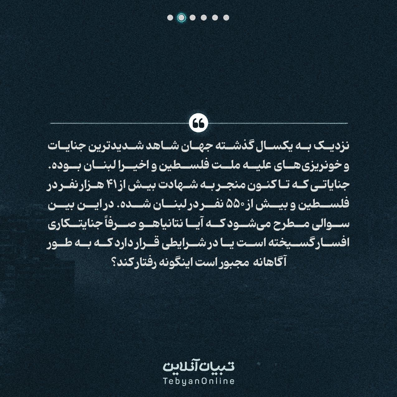 نزدیک به یکسال گذشته جهان شاهد شدیدترین جنایات و خونریزیهای علیه ملت فلسطین و اخیرا لبنان بوده. جنایاتی که تا کنون منجر به شهادت بیش از 41 هزار نفر در فلسطین و بیش از 550 نفر در لبنان شده. در این بین سوالی مطرح میشود که آیا نتانیاهو صرفاً جنایتکاری افسار گسیخته است یا در شرایطی قرار دارد که به طور آگاهانه مجبور است اینگونه رفتار کند؟