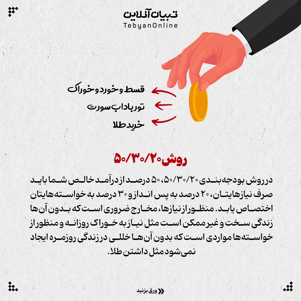 در روش بودجهبندی 20/30/50، 50 درصد از درآمد خالص شما باید صرف نیازهایتان، 20 درصد به پس انداز و 30 درصد به خواستههایتان اختصاص یابد. منظور از نیازها، مخارج ضروری است که بدون آنها زندگی سخت و غیر ممکن است مثل نیاز به خوراک روزانه و منظور از خواستهها مواردی است که بدون آنها خللی در زندگی روزمره ایجاد نمیشود مثل داشتن طلا.