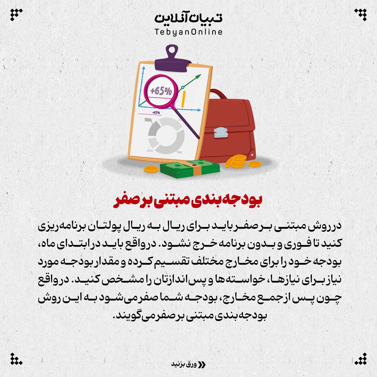در روش مبتنی بر صفر باید برای ریال به ریال پولتان برنامهریزی کنید تا فوری و بدون برنامه خرج نشود. در واقع باید در ابتدای ماه، بودجه خود را برای مخارج مختلف تقسیم کرده و مقدار بودجه مورد نیاز برای نیازها، خواستهها و پساندازتان را مشخص کنید. در واقع چون پس از جمع مخارج، بودجه شما صفر میشود به این روش بودجهبندی مبتنی بر صفر میگویند.