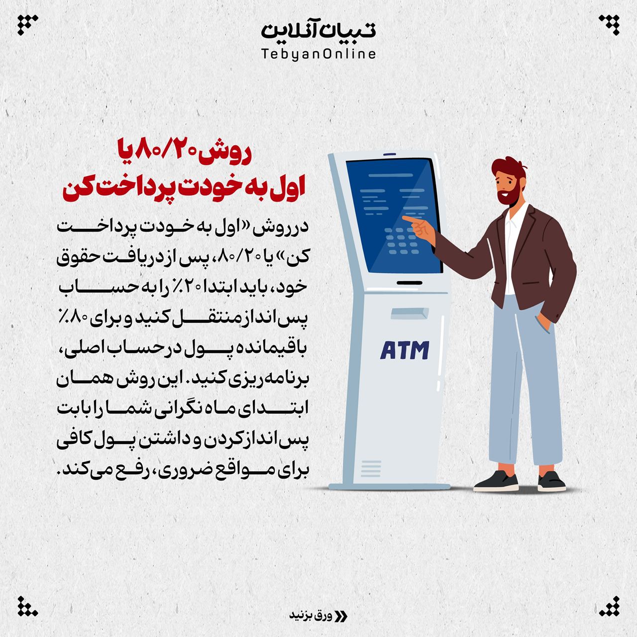 در روش «اول به خودت پرداخت کن» یا 20/80، پس از دریافت حقوق خود، باید ابتدا 20% را به حساب پسانداز منتقل کنید و برای 80% باقیمانده پول در حساب اصلی، برنامهریزی کنید. این روش همان ابتدای ماه نگرانی شما را بابت پسانداز کردن و داشتن پول کافی برای مواقع ضروری، رفع میکند.