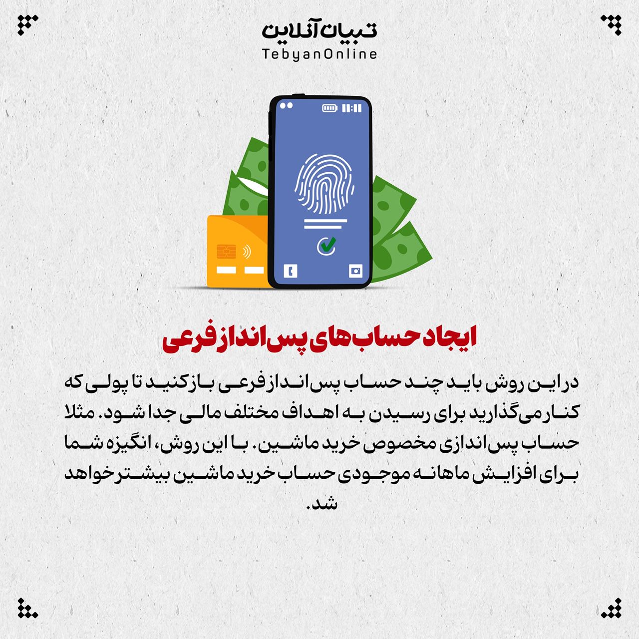 در این روش باید چند حساب پسانداز فرعی باز کنید تا پولی که کنار میگذارید برای رسیدن به اهداف مختلف مالی جدا شود. مثلا حساب پساندازی مخصوص خرید ماشین. با این روش، انگیزه شما برای افزایش ماهانه موجودی حساب خرید ماشین بیشتر خواهد شد.