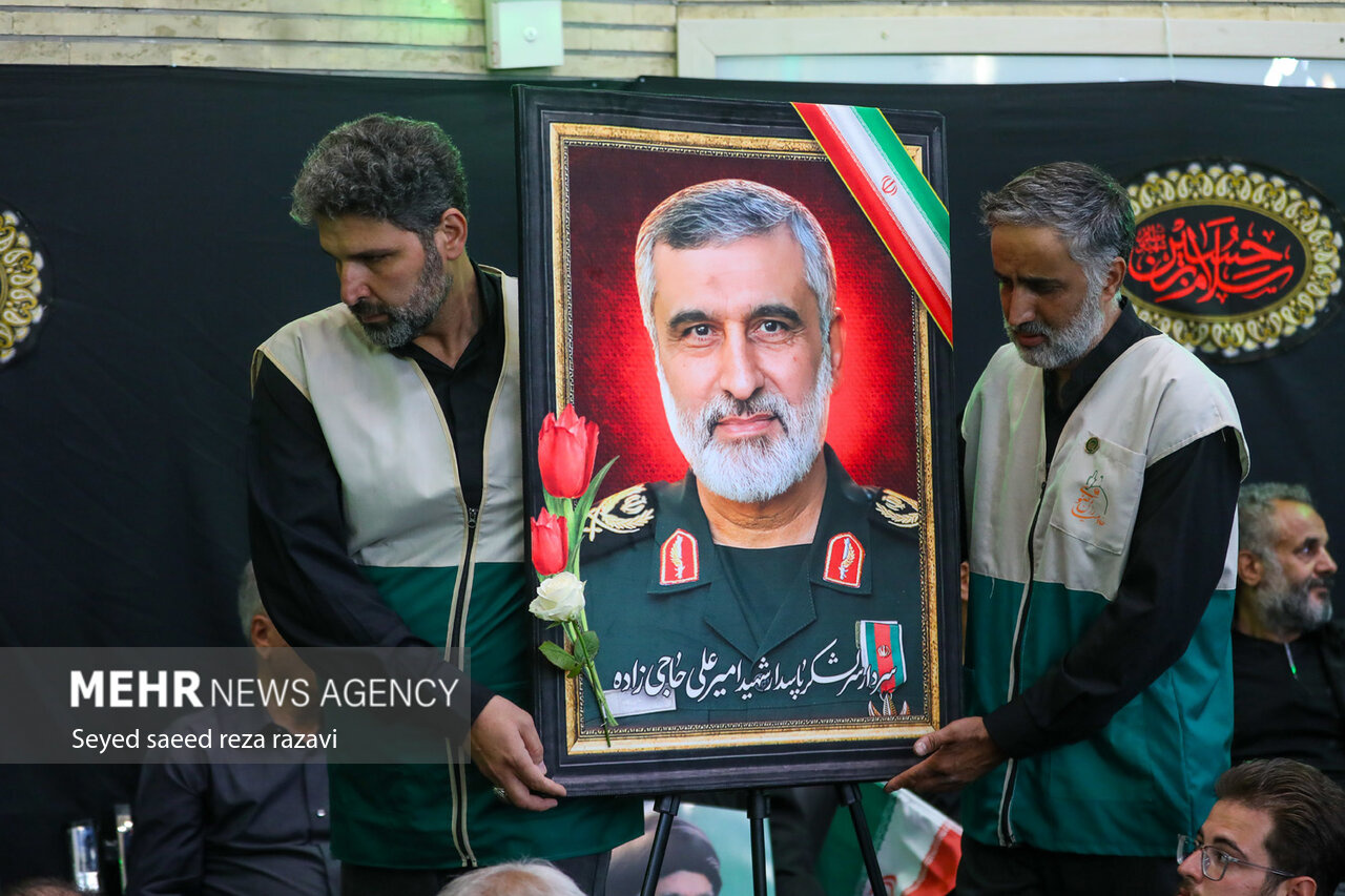 مراسم گرامیداشت شهادت سردار سرلشکر پاسدار «امیرعلی حاجیزاده» فرمانده فقید نیروی هوافضای سپاه پاسداران انقلاب اسلامی عصر امروز جمعه ۲۰ تیر ماه ۱۴۰۴ با حضور پر شور مردم و مقامات لشکری و کشوری در مسجد ابوذر منطقه ۱۷ تهران برگزار شد. منبع: مهر