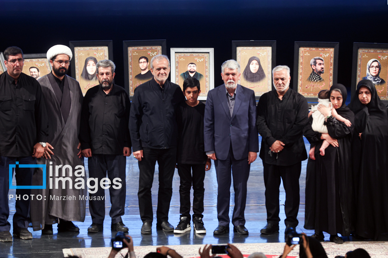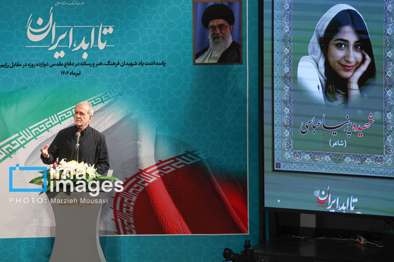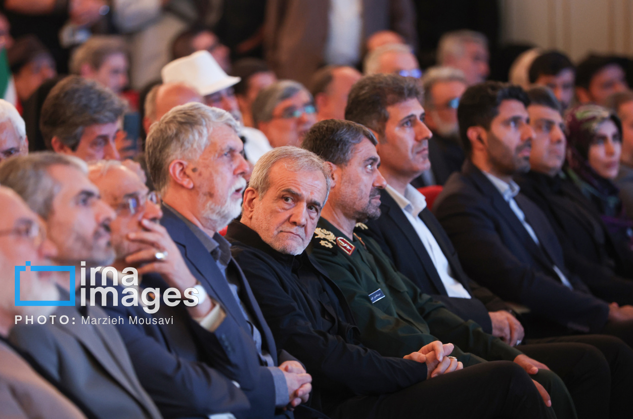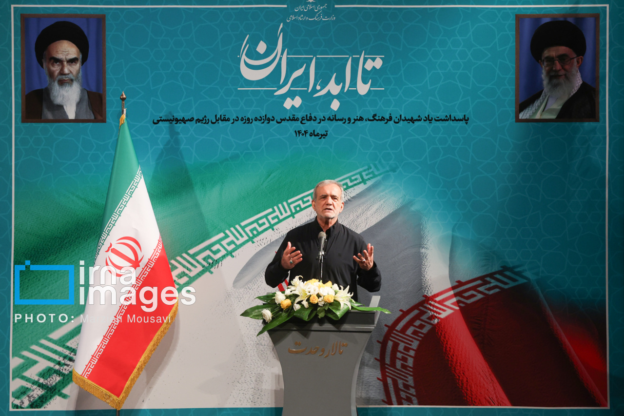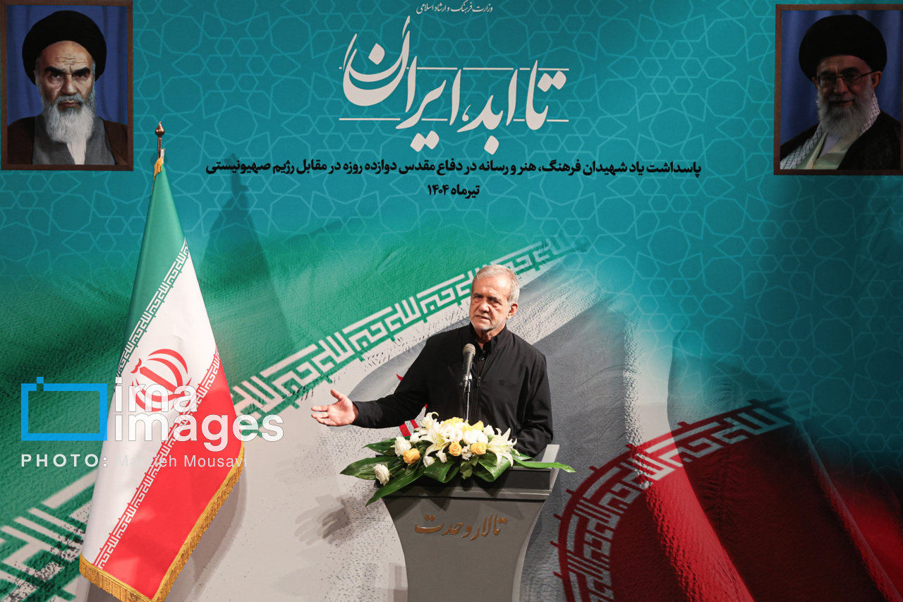 مراسم پاسداشت یاد شهیدان فرهنگ، هنر و رسانه در دفاع مقدس ۱۲ روزه مقابل رژیم صهیونیستی با عنوان «تا ابد، ایران»، سه شنبه (۳۱ تیر ۱۴۰۴) با حضور «مسعود پزشکیان» رئیس جمهور، «سیدعباس صالحی» وزیر فرهنگ و ارشاد اسلامی در تالار وحدت تهران برگزار شد. منبع: ایرنا
