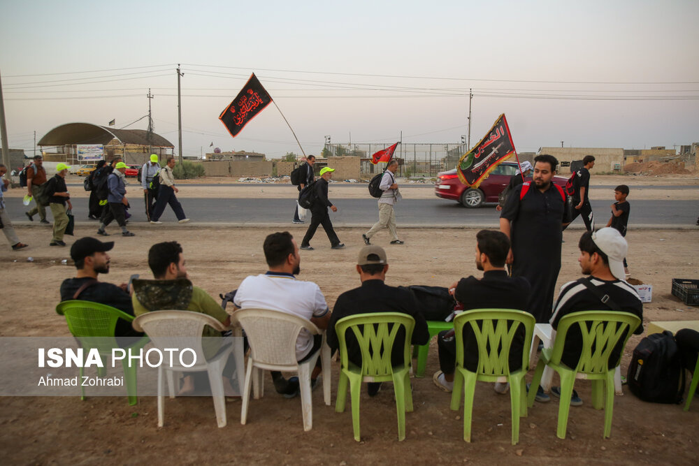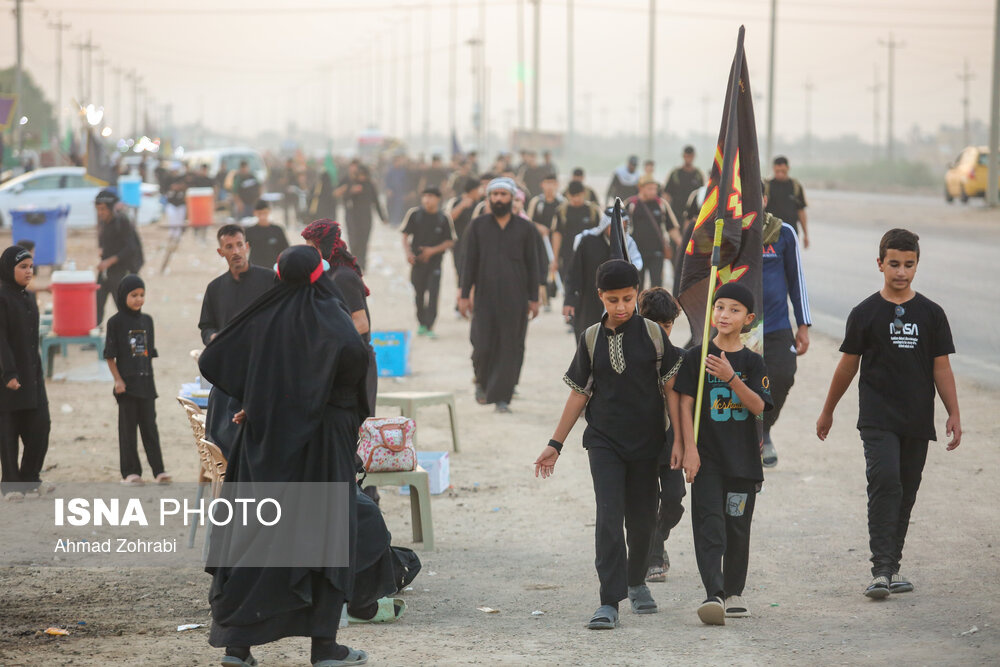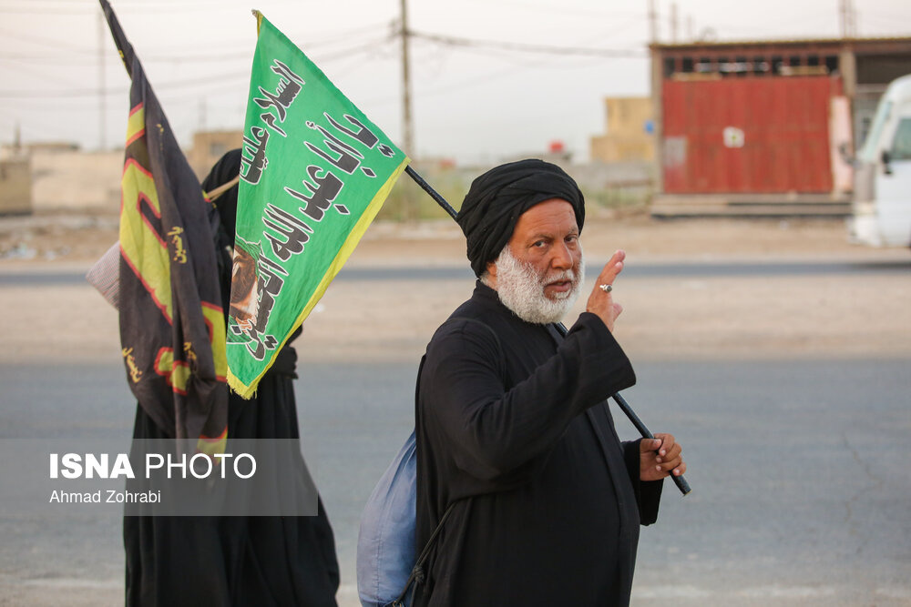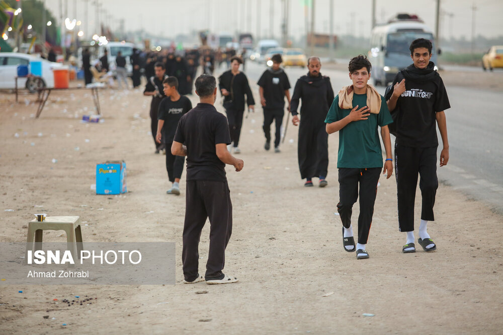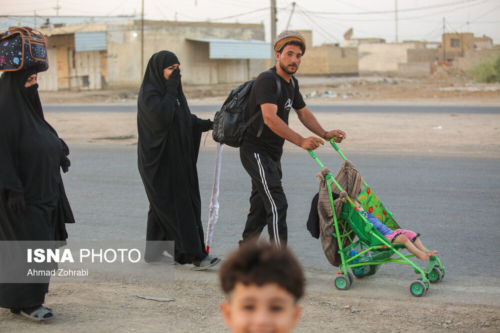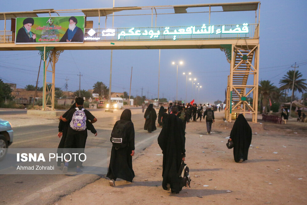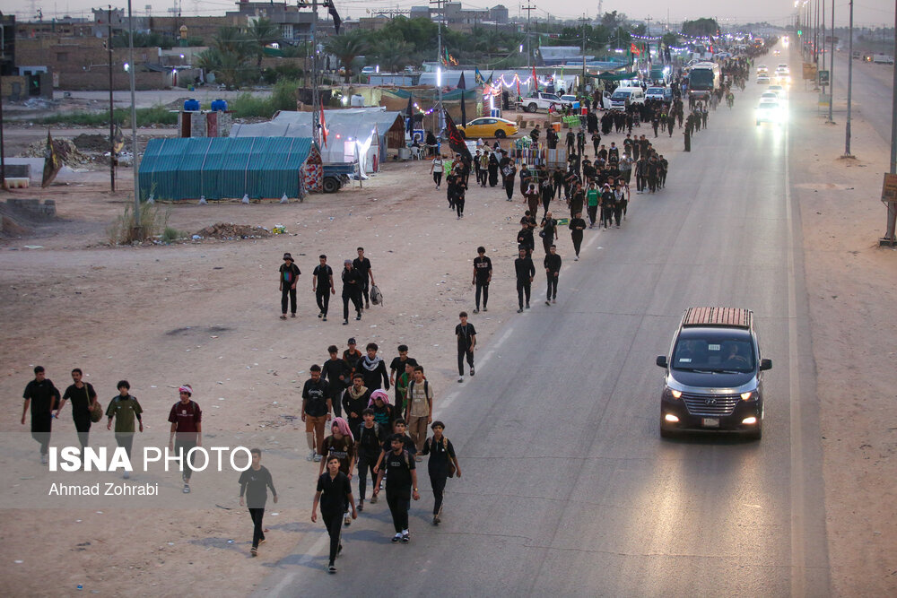 زائران در منطقه شافعیه عراق پس از اقامه نماز صبح حرکت خود را آغاز کرده و به سمت نجف اشرف حرکت میکنند. گرمای در حدود ۵۰ درجهای این روزهای عراق موجب حرکت سحرگاهی زوار اربعین حسینی در کشور عراق شده است.
